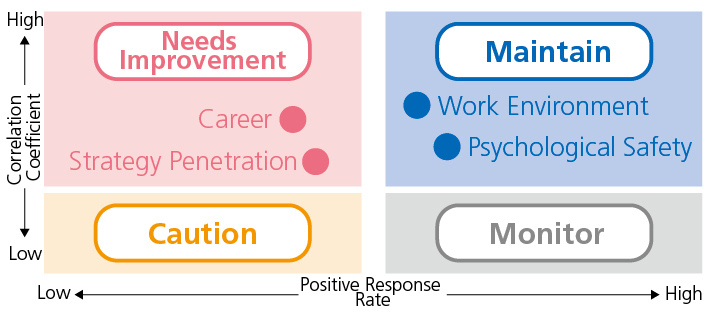 In fiscal 2023, the following three categories were identified as areas for improvement: strategy penetration, dialog with the management, and careers. Rather than existing as independent issues, we see them as connected.
