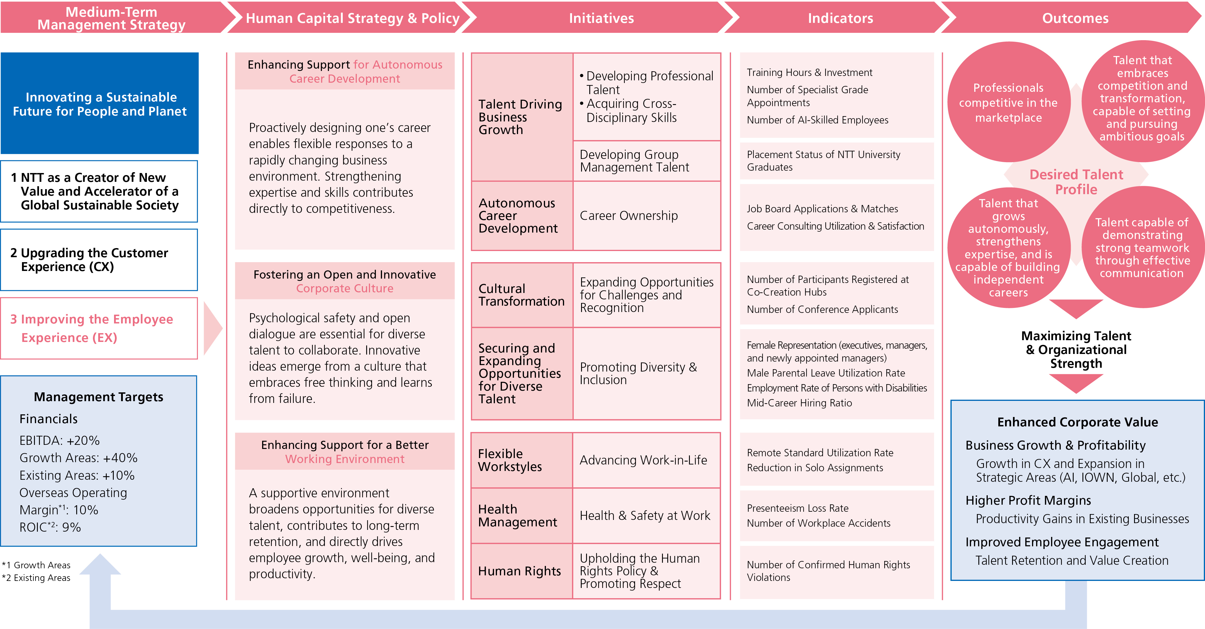 As part of the human resources strategy to realize our management strategy, we will improve EX to ensure that diverse talent can challenge themselves to create new value and innovations while finding their work rewarding and experiencing personal growth. The effectiveness of these initiatives will be monitored over time by establishing indicators for the three pillars of the human resources strategy. By properly reviewing and continuously implementing these initiatives, we will deliver outcomes that lead to improved CX and increased productivity, which in turn will improve business growth and corporate value.