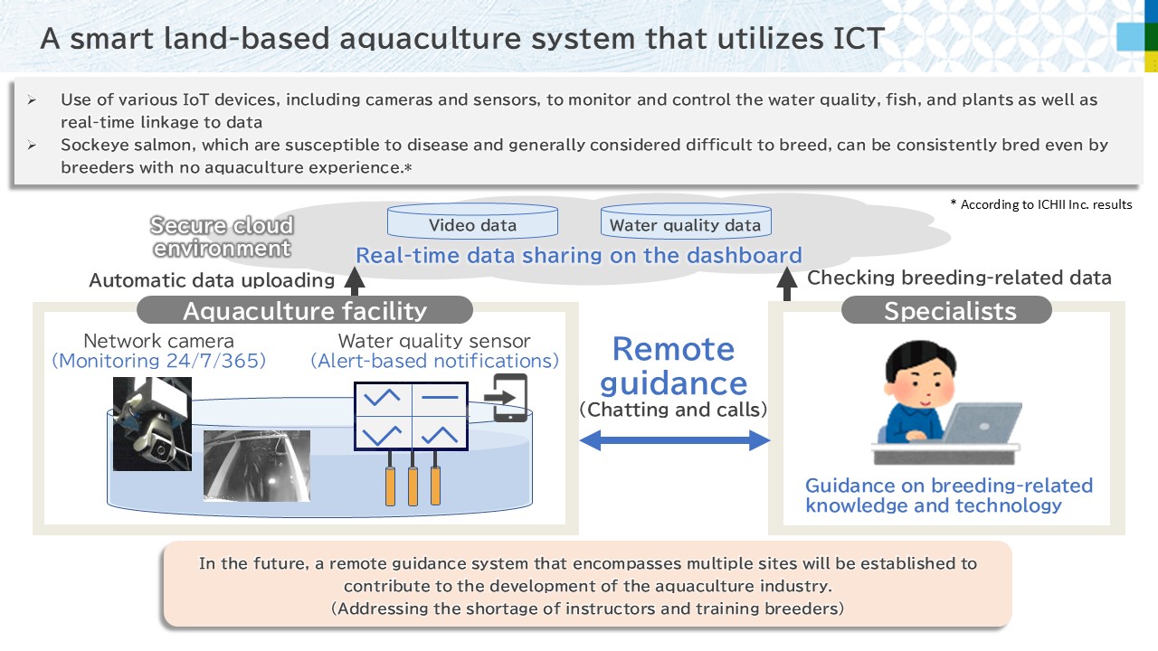 "In the case of conventional aquaculture, it was necessary to rely heavily on experienced specialists and the suitable natural environment, but our completely closed-loop land-based aquaculture facility can be stably operated without any specialized knowledge or experience. With the IT platform we developed, we automatically obtain and centrally manage data related to the plant environment where we raise fish."