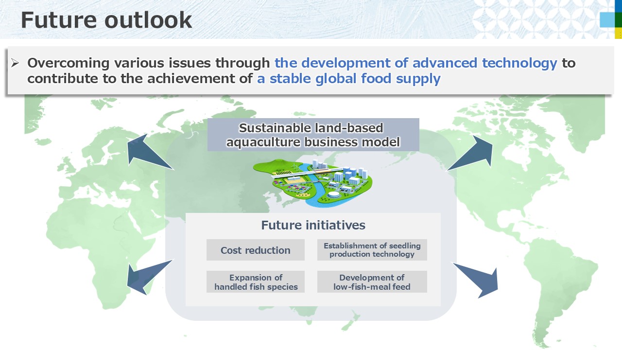 "As Japan's population decreases, its demand for food will as well, but overseas demand for fish is increasing as overseas populations increase. Many overseas countries lack abundant water resources, and I think that, by exporting systems and associated technology, we can help resolve the crucial social issue of securing protein sources for the increasing global population."