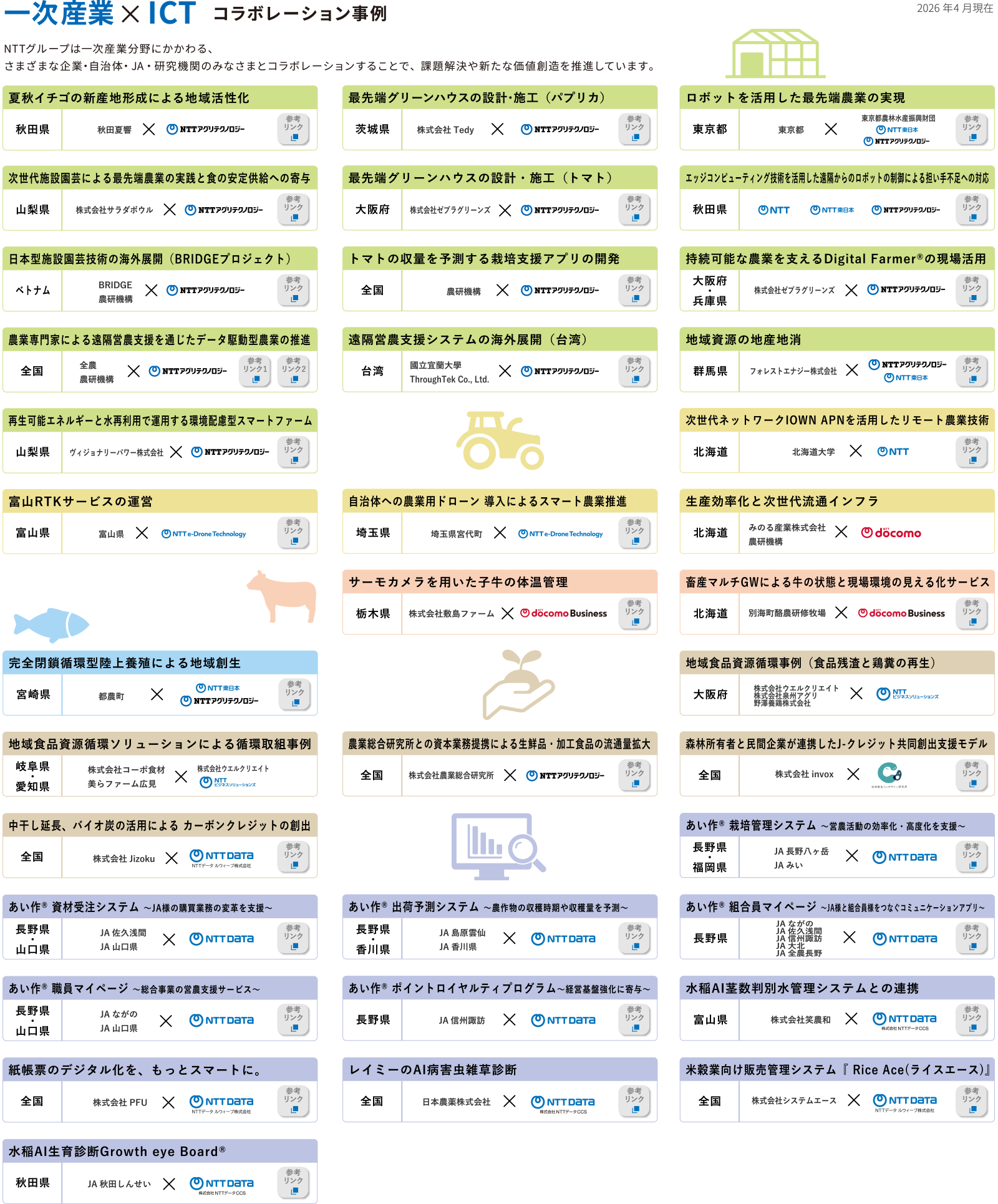 NTTグループ各社のサービス及び研究所の技術を集結させると共に、ビジネスパートナーとの密な連携により、「生産」から「消費・食」までをつなぐNTTグループの食農バリューチェーンを実現します。