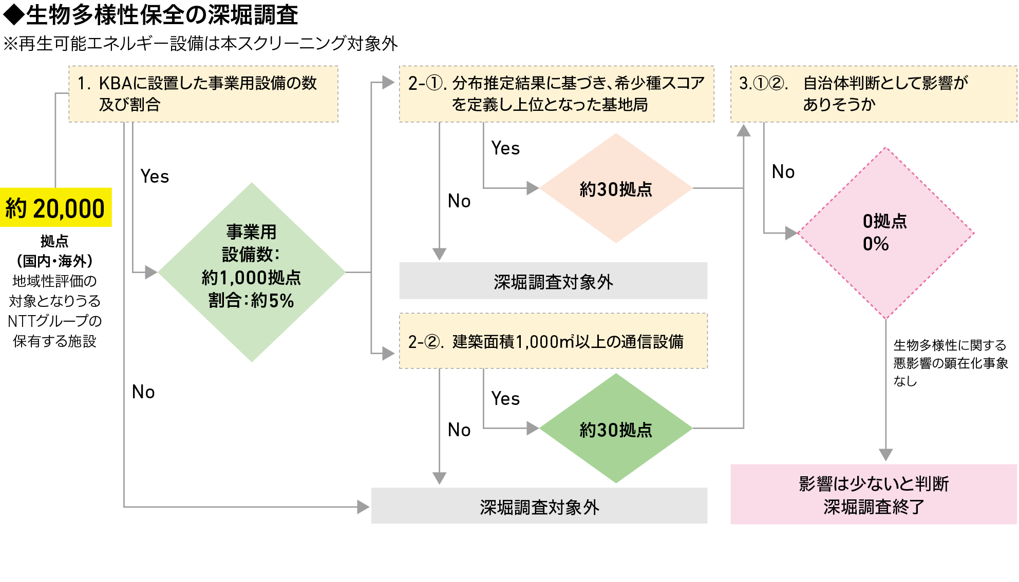 事業用設備のうち自然への影響が大きいと考えられる基地局※1・通信設備・データセンター設備の約2 万拠点を対象に、KBA※2をもとにスクリーニングし、深掘り調査を行いました。