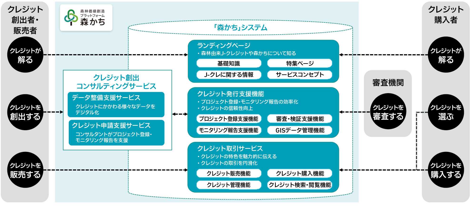 住友林業株式会社とNTTドコモビジネスは、2024年8月から「森林価値創造プラットフォーム」(以下「森かち」)を提供しています。「森かち」は、森林由来J-クレジット※1の創出・審査・取引を包括的に支援するプラットフォームです。日本で初めて※2森林クレジットの創出者・審査機関・購入者それぞれに対して地理情報システム(GIS※3) の機能を提供することで発行プロセスの効率化とクレジットの信頼性向上を実現し、森林クレジットの創出・流通活性化をめざします。