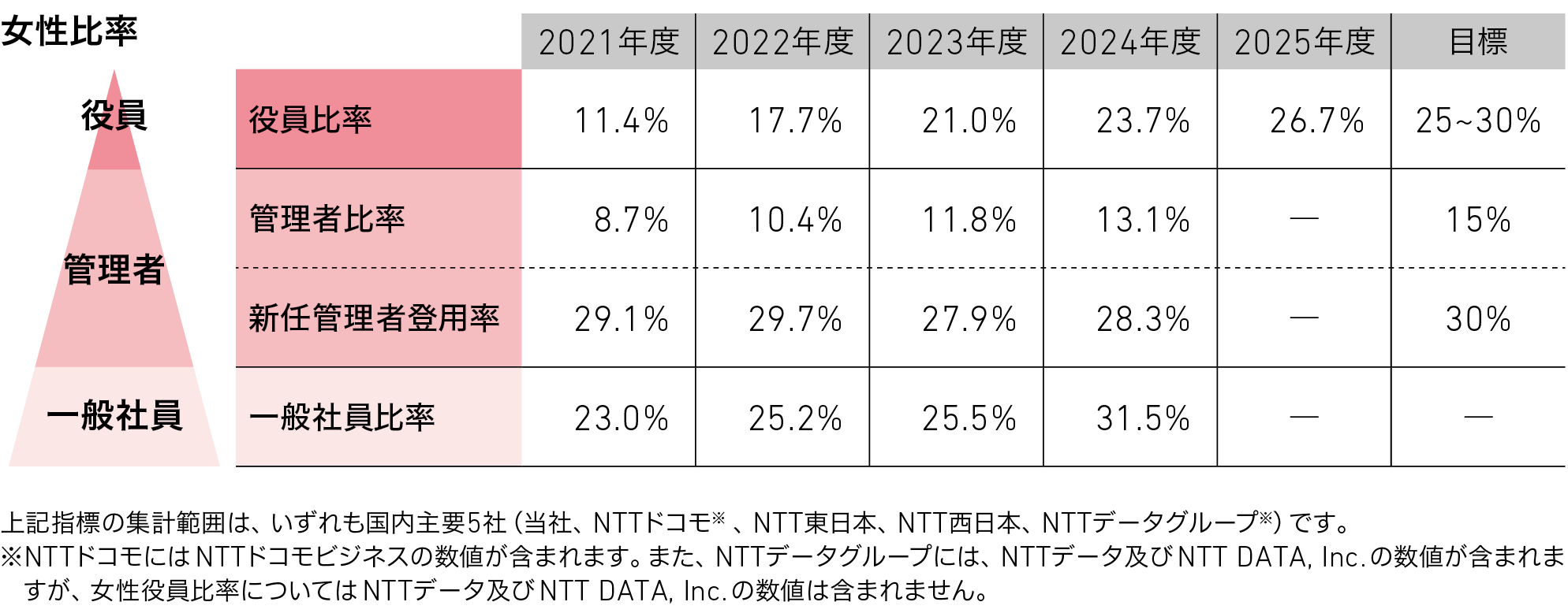 NTTグループでは意思決定の場に多様な意見を取り入れるため、女性役員・女性管理者・新任女性管理者に対して目標値を設定しています。2024年6月には、女性役員比率は23.7%(対前年+2.7ポイント)となりました。また、2024年度実績として、女性新任管理者登用率は28.3%(対前年+0.4ポイント)、女性管理者比率は13.1%(対前年+1.3ポイント)でした。