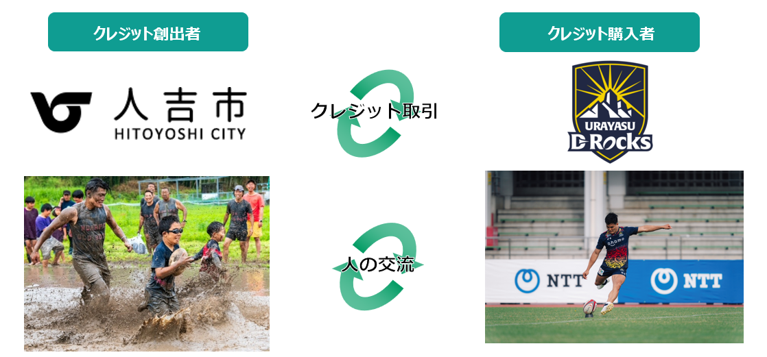 第二の特長は、クレジット売買にとどまらない"人と人をつなぐ取り組み"を行っていることです。NTTのラグビーチーム「浦安D-Rocks」は、ホストゲーム開催に伴い排出されるCO2をオフセットするため、熊本県人吉市のクレジットを購入。この取引をきっかけとして、選手たちが実際に現地にも訪れて、子どもたちと田んぼラグビーを楽しむイベントに参加しました。