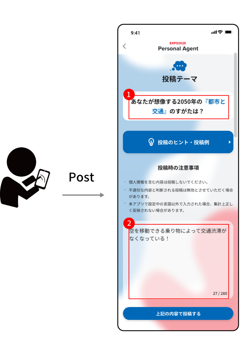 Personal Agent will facilitate an efficient and enjoyable experience tailored to individual visitors in conjunction with venue conditions and personal preferences and circumstances. The Personal Agent will aid visitors, creating the optimal experience for them, facilitating efficient movement between exhibits, creating an advanced experience, and contributing to visitor satisfaction. We will also guide you through exhibits and suggest enjoyable ways to spend your day according to your interests, whether you are a first-time visitor or a frequent visitor to the Expo.