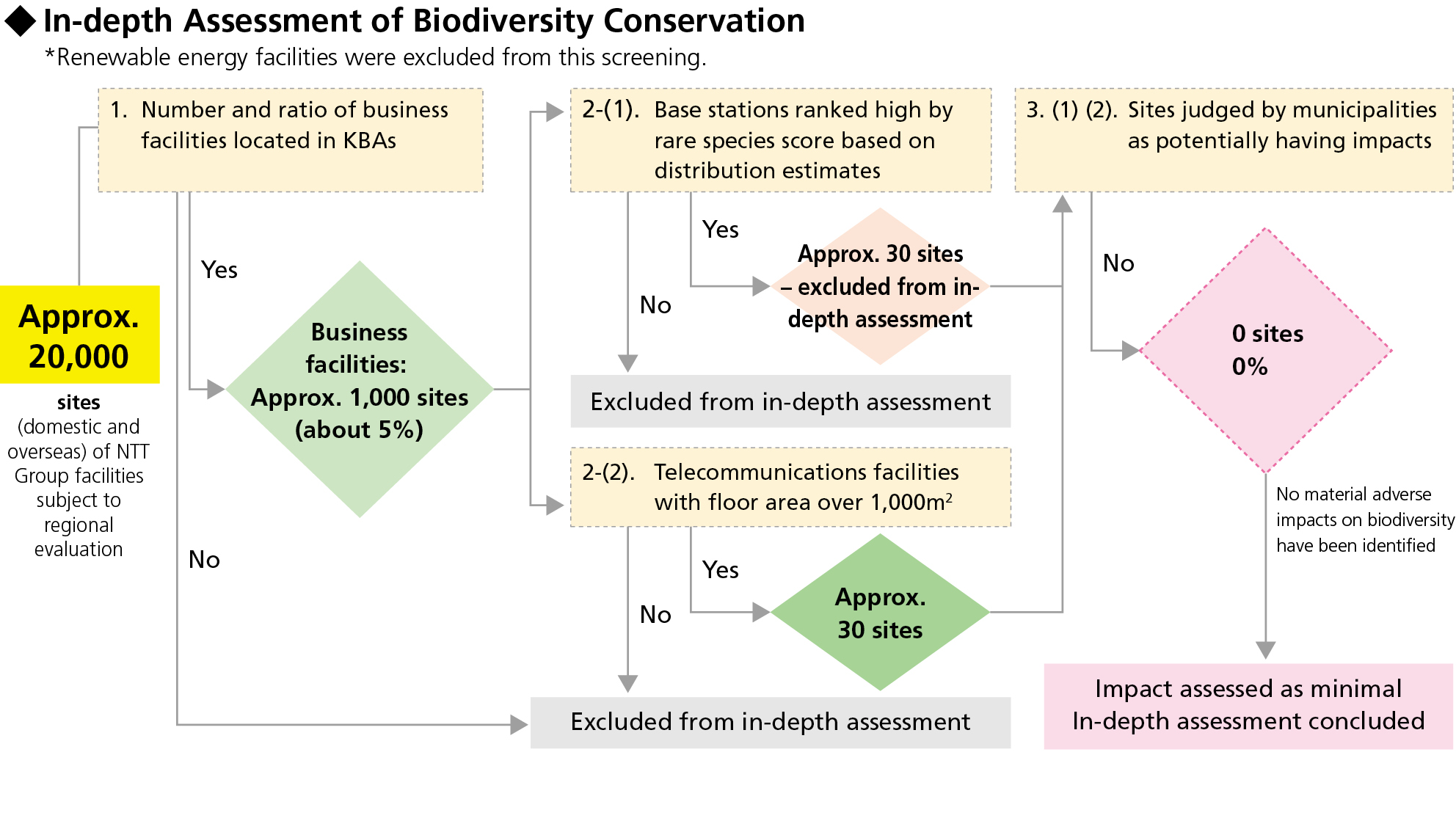 Considering materiality, we assessed biodiversity and water use impacts not only for the base stations and data centers identified by ENCORE, but also for telecommunication facilities with a building area over 1,000 m² and for renewable energy facilities such as solar and wind power that may have larger impacts on nature.