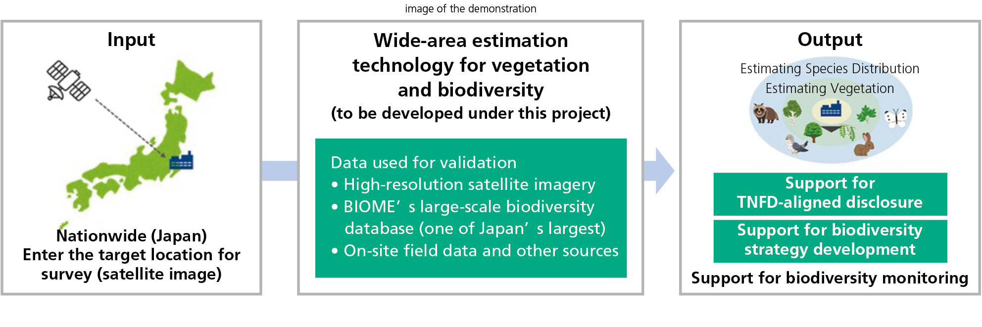 In March 2025, development of remote sensing technology for estimating vegetation and organisms across a wide area began at BIOME, DOCOMO BUSINESS, DOCOMO SOLUTIONS, NTT DATA, and DOCOMO. Combining NTT Group assets such as satellite image analysis technology and BiomeDB, Biome's real-time organism database, which is one of the largest in Japan and contains over 10 million items, we helped establish a method of continuously collecting and analyzing data over a wide area related to vegetation and organisms for supporting biodiversity monitoring. This promotes efforts to minimize the impact on biodiversity and contributes to achieving nature positivity as a society.