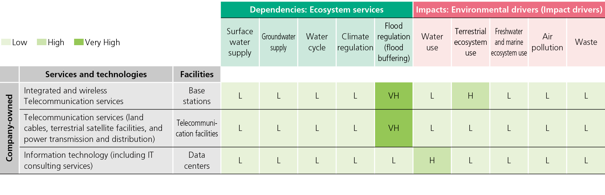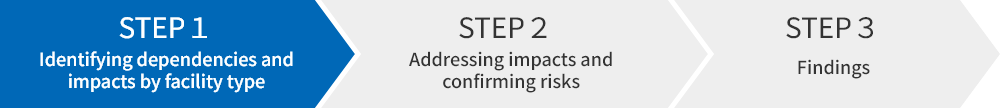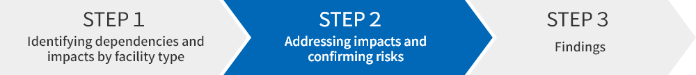 Following the TNFD-recommended LEAP approach, the NTT Group focused on facilities that support service groups with the greatest revenue impact--base stations, telecommunications infrastructure, and data centers--to identify nature-related dependencies and impacts, then assessed the likelihood of risk materialization.