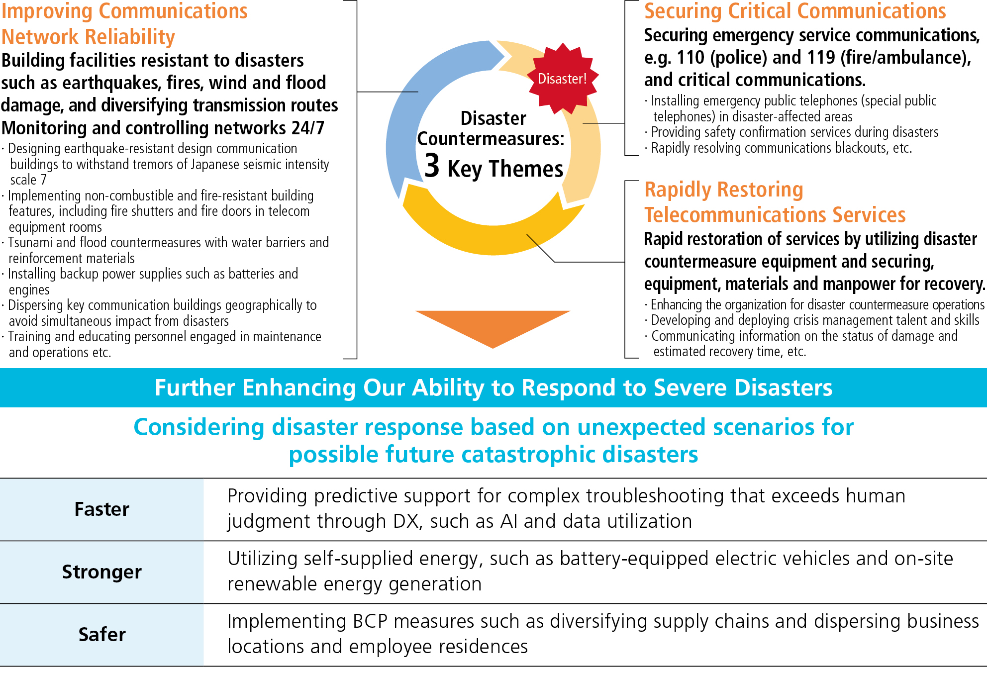 In recent years, disasters of greater magnitude have had significant impact.To address the increased impact on telecommunications equipment and services, as well as the longer time required to resume operations, we are also promoting additional initiatives toward such goals as increasing the resilience of our equipment and speeding up recovery.