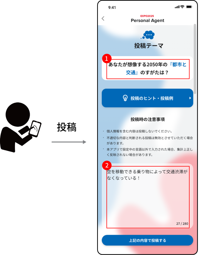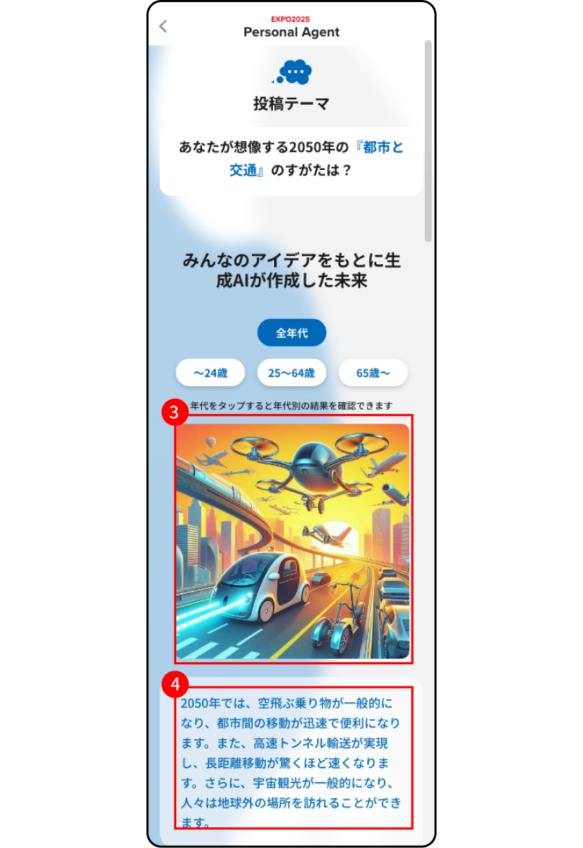 来場者が考える未来社会のアイデア投稿をもとに、来場者全体の集合知として「みんなが想像する未来社会」をアプリ上で公開。