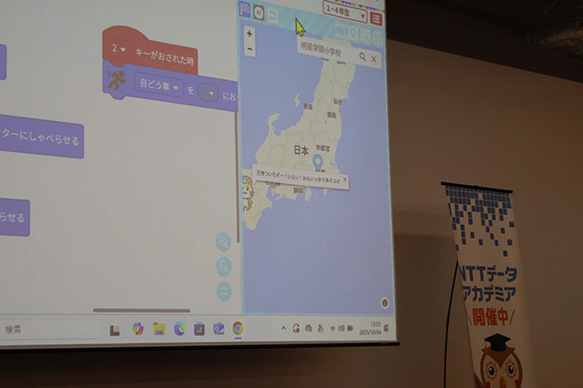 デジタル地図を活用したプログラミング教材『まなっぷ』を使用し、子どもたちそれぞれが通う小学校から万博会場まで、キャラクターを動かして案内するミッションに挑戦します。まなっぷはブロックを組み合わせることで、地図の上に線を引いたり、キャラクターを動かしたりすることができるプログラミングツールです。使い方の基本を学んだ後は、それぞれの会場への道のりを実際にプログラミングで表現する作業を行います。何度も万博会場に来ている子も始めて来た子も、集中してそれぞれの道のりマップ作りを頑張っていました。