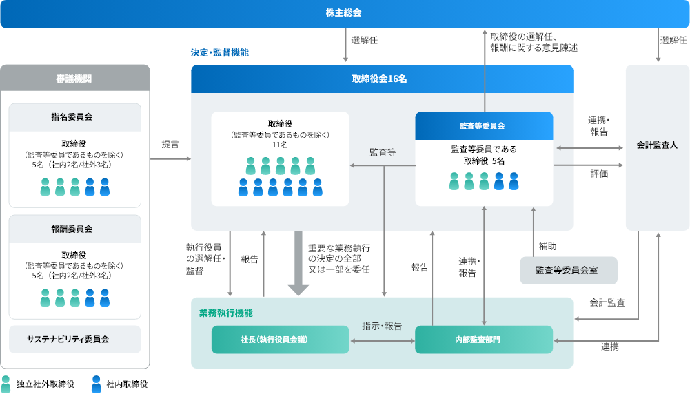 | 取締役会 | 取締役会は、独立社外取締役8名を含む取締役16名で構成され、社外取締役比率は50%となっています。また、執行役員制度を導入し、経営に関する決定・監督の機能と業務執行の機能を明確に分離することで、執行に対する監視機能と経営の機動力を担保しています。取締役会は、原則として毎月1回の定例取締役会を開催し、必要のある都度臨時取締役会を開催することで、グループ経営戦略に関する議論に加え、法令で定められた事項、及び会社経営・グループ経営に関する重要事項を決定するとともに、取締役及び執行役員から定期的に職務執行状況の報告を受けること等により、取締役及び執行役員の職務執行を監督しています。 独立社外取締役については、それぞれ豊富な経験を有し、人格、見識ともに優れていることから、業務執行の監督機能強化への貢献及び幅広い経営的視点からの助言を期待するものです。 なお、当社は、取締役会による役員等の指名・報酬の決定等における独立性、客観性及び説明責任の更なる強化を目的に、取締役会の事前審議等機関として5名の取締役で構成(過半数である3名が独立社外取締役)される指名委員会、報酬委員会を任意に設置し、ガバナンスの有効性を高めています。 加えて、サステナビリティを巡る課題への対応が重要な経営課題であるとの認識のもと、サステナビリティ委員会を取締役会直下の機関として任意に設置し、重要な課題・指標の決定については、取締役会で決議することで、その取り組みの更なる推進を図っています。 |
