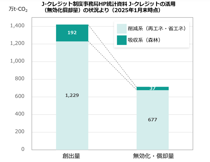 再エネ・省エネクレジットに比べ、森林由来の創出量は約10%、無効化・償却量は約5%と低い