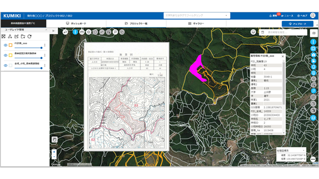 「森かち」には、従来のカーボンクレジット取引プラットフォームとは一線を画す、次の特長があります。第一はシステム面で、GIS(地理情報システム)を活用した地図ベースでの情報可視化機能を用い森林の位置情報、施業履歴、樹種など、分散管理されていた情報を統合して、地図上で参照できるようにしました。これにより、購入者はクレジットが創出された森林位置の把握ができ、所有者・審査機関は森林の位置情報を含め、その他プロジェクトの登録やクレジットの認証・発行の際に必要な情報を簡単に共有でき、審査の効率化と透明性向上を実現することができます。